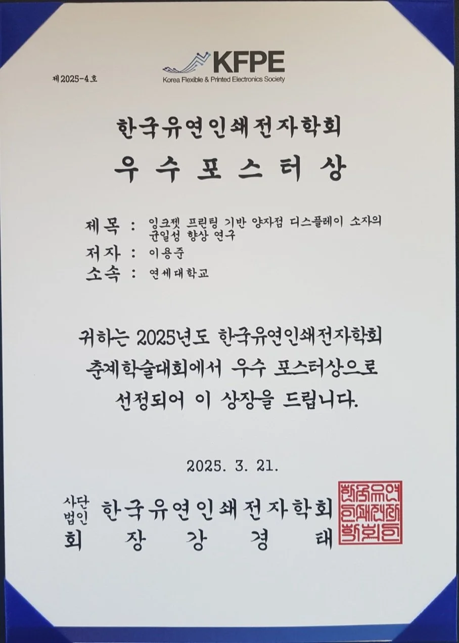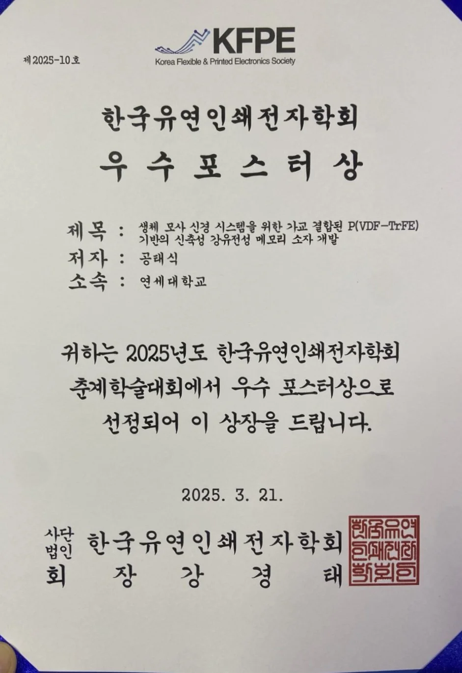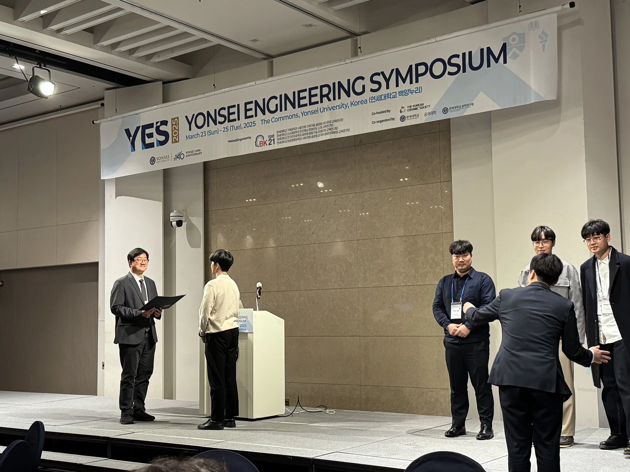 March 2025: Prof. Kim contributed as an organizing committee member for the Yonsei Engineering Symposium 2025 (YES 2025), held in celebration of Yonsei University’s 140th anniversary. The symposium served as a valuable opportunity to host distinguished speakers from abroad and to engage in insightful talks across diverse engineering fields. Seongsik received the award!